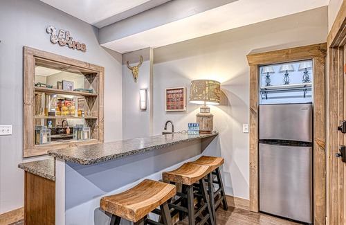 The main level offers a well-equipped kitchen, a great room, a primary suite with a private balcony, and two guest bedrooms that share a bath. The lower level provides another primary suite, a guest suite, a family room, a game area, and a wet bar. The loft area has extra sleeping space as well.