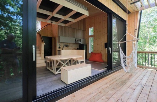 This cabin, on the backside of Mont-Orford Park, is situated on the immense 1000-acre Vertendre forest playground. This protected, private territory offers 2 lakes and a mountain where you can enjoy a wide range of outdoor activities right on the site. A perfect balance between ecology, innovation, and comfort.