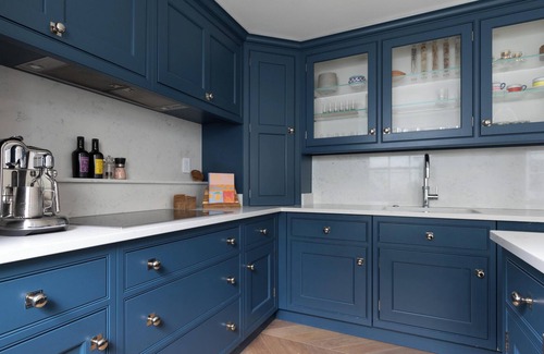 Divine parquet flooring and a cosy fireplace create a tranquil primary living space, complete with a desk for those who need to check in with work. The second living room is the perfect spot for snuggling up in front of the flat screen. A vision of blue and flooded with natural light, you'll love whipping up meals in the sleek kitchen, dining together at the breakfast bar or around the statement dining table.: