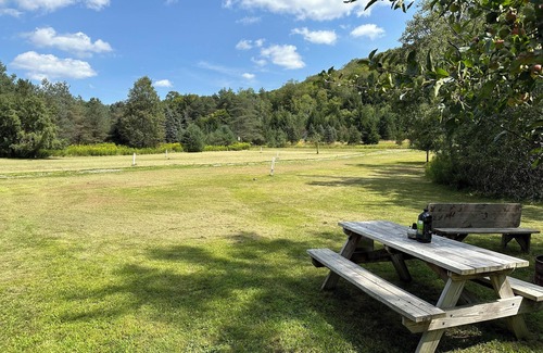 Outside, guests can enjoy a cozy fire pit, a welcoming picnic table, and gentle outdoor lighting to enhance the peaceful and romantic ambiance. Keep your eyes open and binoculars and cameras ready. We are regularly visited by deer, foxes, bears, and bald eagles. A small trail off the field takes you back to a meandering stream to cool your feet, skip rocks, or catch crayfish and other critters.