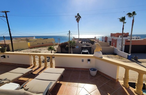 Campbell's House is a beautiful 4 bed, 2 bath split floor plan, that sleeps up to 9 people total, this home is located in the second row in the beautiful Las Conchas private community, Both master bedrooms have ocean views, Master bedroom#1 on West side has a King bed with shared full bathroom with bedroom#2 which consists of a bunk bed with twin over full and a separate twin bed, bedroom#3 has two queen beds , private entrance to full bathroom shared with bedroom#4 which has a King bed (both bathrooms have access from hallways for back bedrooms/living area). Campbell's house is only few steps to the beach with parking for 4 cars. Enjoy this beautiful home with a furnished Margarita deck with breathtaking views of the ocean and amazing colorful sunsets, fully equipped kitchen(excluding dishwasher), blender, toaster, microwave, coffee maker and 5 gallon purified water jug provided. Sheets, towels and soap provided, Central heat and A/C, ceiling fans in all rooms, parking for 4 cars .