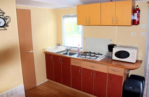 Accommodation: Large mobile home with 1 bedroom with 1 double bed, 1 bedroom with 2 single beds, 1 small bedroom with 1 single bed