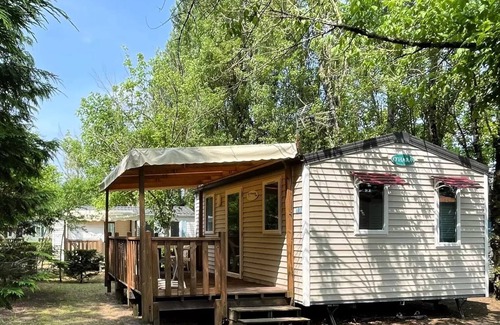 Accommodation: Renovated in 2023, compact mobile home 20m2 perfect for a couple or family with one or two children. Parental room with a bed 140*190 Children's room with double bed, for the joy of small adventurersLiving room / kitchen with TV, refrigerator, microwave, electric coffee maker, hob, electric heating. Tableware adapted to the number of personsBathroom with shower and toiletThe +: the covered terrace to enjoy the pleasant climate of the LandesPillows and duvets provided. Sheets not provided Exterior: Covered terrace, garden furniture, parking space.