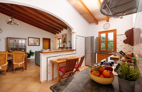 The one-storey house has a simple and comfortable style. The large Majorcan entrance leads to the living-dining room, equipped with satellite TV, a fireplace and a dining table for 4 people. The semi open kitchen has a gas stove. The separate laundry features a washing machine, iron and ironing board. To rest, the house features 2 bedrooms, both with twin beds and a wardrobe. Both bedrooms have direct access to the first of the bathrooms, with a bathtub. There is another bathroom with a shower. Finally, a baby cot, a high chair and gas central heating complete the equipment.