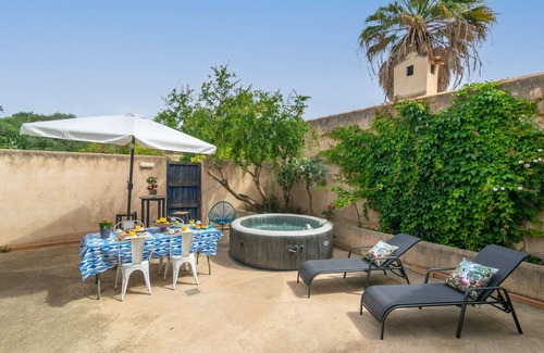 The exterior of the property is ideal to enjoy the Mediterranean climate. In the courtyard you will find several areas where you can eat or have a drink with your companions, sun loungers where you can sunbathe and even a jacuzzi where you can cool off while you relax. There is also a balcony and an upper terrace from where you can admire fantastic views of the nearby mountains. As it is located within the village, the house has direct neighbours. The interior of the three-storey house is designed to give you the rest you deserve. On the ground floor there is a living/dining room, equipped with AC and Smart TV, which opens directly onto the patio through large windows, giving you the opportunity to expand or reduce the space as you wish. The kitchen is independent and has induction and all the necessary utensils to cook comfortably. There is a washing machine, iron and ironing board in the house. A bathroom with shower serves this floor. A staircase leads to the 3 bedrooms, all with double beds and air conditioning. On the first floor there are two of them, plus a separate bathroom with bathtub. On the top floor is the last bedroom, which has a dressing room and en-suite bathroom with shower and bathtub. If you are travelling with your baby, we can provide a cot and highchair. The location of the property is ideal if you are looking to get to know one of the most traditional parts of the island. Vilafranca de Bonany is a small village where the charm is palpable with just those little shops selling fruit and vegetables grown by the local people, and the typical Mallorcan bars and restaurants. Manacor, on the other hand, is nearby and has much more commercial and other activity. The house is situated only 500 m walking distance from the centre of the village and about 15 minutes (10 km) by car from Manacor, the birthplace of tennis player Rafa Nadal and as proof of this, the Nadal Museum Experience will offer you a unique experience where you will enjoy an exclusive exhibition of his best trophies and equipment as well as amazing light and sound shows. If you want to visit the beaches, the nearest one is Porto Cristo, about 30 minutes by car. Note: We cannot accept guests under 25 years unless you are a family. We need copies of the passports of all guests in order to accept the booking. Consult the advertiser for possible charges. Pets are not allowed. The holding of events is forbidden. Distances Beach: 26.2 km - Porto Cristo Airport: 40.7 km - Palma de Mallorca Golf course: 29.3 km - Golf Son Gual Town: 0.5 km - Vilafranca Train station: 10.3 km - Manacor Bus stop: 0.55 km - Vilafranca Ferry: 38.9 km - Alcudia Hospital: 11 km - Hospital de Manacor Tourist license: ETV/12397There's a mandatory tourist tax in Balearic Islands, called Ecotasa. All guests, except people under 16 years, have to pay this tax. The amount varies between 0.55€/night and guest during the low season and 2.2€/night and guest during the high season .The tax is reduced by half from the 9th day for your stay.