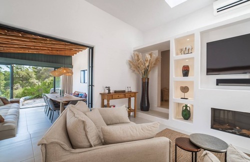 The alfresco breakfast table overlooks the 2 large terraces which descend to the lower gardens. BBQ area on the bottom terrace. 250Mbs fibre-optic broadband. Apple TV and 2 large flat-screen TV for nights in with your Netflix and Amazon Prime Video account. 1 TV in the dining room and 1 in the separate living room. The perfect holiday house, only 10 mins from Ibiza town, the marina and many of the clubs yet in the hills away from the crowds! The airport is only 14 mins depending on traffic from Jesus, our local town.
