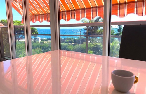 2 bedroom apartment + living room, direct sea view, air conditioning, communal pool and garden, recently renovated with stylish features, secured garage and parking inside the residence, direct access to the beach within 1-2 minutes walk from the front door of the garden. Super fast WIFI internet (fibre Orange), French TV channels + Apple TV, fully equipped kitchen with oven, microwave, dishwasher, washing machine, coffee maker, cutlery, pots, glasses, dishes, etc. Power shower. Veranda of the living room can be completely opened for a full sea view. It can accommodate comfortably max 5 people. While the beds/sofa options are possibly for more people, MAX 5 guests at each single time are possible given the size of the apartment. Total approximate size: 50 square meters.