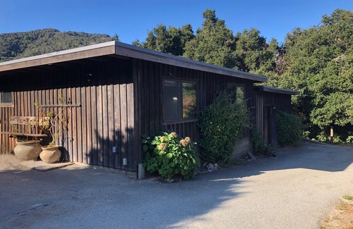 This cute and rustic, two bedroom, one bath home is surrounded by giant oak trees and is at the end of a quiet private drive. There is a wrap-around deck and lots of outside space for relaxing and enjoying the tranquility of Carmel Valley. Includes access to our pasture deck with sweeping views of Garzas Canyon - a tranquil spot to watch the sunset with a glass of wine or do yoga in the morning, in the company of three friendly mini goats.