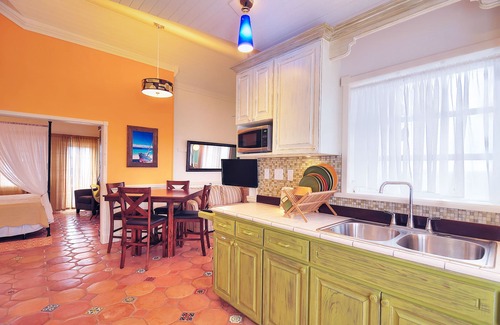 Note – the unit you are renting is called Royal Poinciana and is the top floor King Suite with awesome views of both the Caribbean and Atlantic Ocean from inside the unit and course outside with the 360 degree wrap around deck. Note you have a large portion of the 3rd floor balcony which is blocked off with a privacy door so no other guests can enter your space. There is also a dining table outside in your private section for al-fresco with ocean views! The unit is bright and airy with lots of French doors and windows. The pure white vaulted ceilings are cypress wood tongue and groove style along with gorgeous custom terracotta tile floors. Ceiling fans are located in every room along with very efficient AC units. The King Suite sleeps 4 people very comfortably, adults or kids. There is a very high quality canopy King size bed with high end mattress and top of the line linens for 2 adults in an enclosed private bedroom. The guest bedroom/sleeping area is off the living room and has two twin beds and in its own separate room, although it is a smaller room - see photos. ***Note the guest bedroom is locked unless the reservation is for three or more people. If you have any questions or wish to have the second room open just ask us. The overall décor is lovely, tropical and filled with bright and colorful Caribbean theme. The big and beautiful kitchen has everything you need from cooking full meals and sit down dining for 4 people. It has all the goodies you need like coffee maker, toaster, blender, cookware, wine glasses, etc. There are USB phone chargers and a hairdryer provided also. Of course you have the basics such as; seasonings, soap and shampoo, linens, towels, beach and bath towels, kitchen towels, toilet paper, paper towels, trash bags, kitchen sponge and dish soap, iron and ironing board, etc. There is a small library of books for your reading pleasure. Beach chairs and beach umbrella is also provided. It is the nicest and by far the biggest unit at almost 600 sq ft of living space not counting exterior decking. You can see the photos section for a better visualization of the interior and exterior of your unit. Note you have an entire section of the 3rd floor balcony which is all blocked off with a privacy door so no other guests can enter your space. There is also a full size dining table outside for al-fresco eating with ocean views!