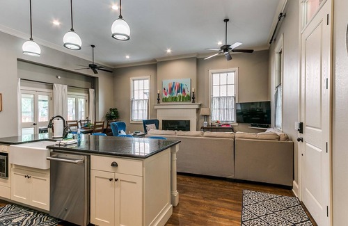 This 3 bedroom, 2.5 bath cottage features a spacious open living/dining/kitchen area, with the added comfort of a large sectional and large screen TV paired with a Bose Bluetooth soundbar. The dining table seats 10, and the space can be extended through two French doors leading out to a sunroom with Polywood patio settees and chairs. The kitchen has a large island that which seats 4, GE appliances, iCoffee K-cup brewer, and is fully stocked with the essentials to meet the needs of the best cook. It is adjoined by a half bath.
