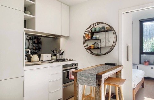 The compact kitchen comes fully equipped for your holiday catering with an oven, stove and dishwasher for easy clean up. You’ll also find some of the city’s best restaurants and bars within a short walk away. There’s a hightop dining table as well as a proper desk and chair for those needing to set up their laptop.