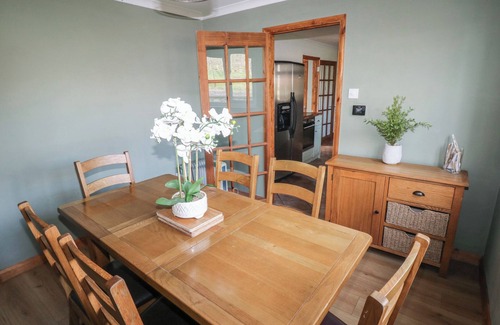 Carreg Yr Onnen is a house consisting of a kitchen with electric oven and hob, fridge/freezer, and dishwasher, a utility room with washing machine and tumble dryer, a dining room with seating for eight guests, and a sitting room with wood-burning stove and Smart TV. The bedrooms consist of three king-size rooms and a family room with a bunk and single bed, serviced by a bathroom. WiFi, fuel, power, bed linen, and towels are included in the rent. Outside, there is an enclosed garden with patio, gravel, and furniture, and off-road parking for two cars. Within 0.4 miles you will find a shop and 0.3 miles a pub. Two well-behaved dogs are welcome. Sorry, no smoking. Find your perfect escape at Carreg Yr Onnen.