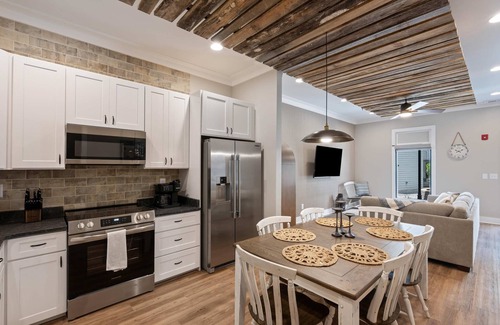 Step through the gate into a serene courtyard, where cozy seating invites you to sip morning coffee or unwind under the stars. Inside, the entire unit wraps you in warmth and comfort, offering a peaceful space to relax after a day of exploration. In the living room, a plush sofa and smart TV await cozy movie nights or quiet mornings with your favorite book. The eat-in kitchen is both stylish and functional, featuring dark countertops, warm white cabinetry, stainless steel appliances, and both single-serve and drip coffee makers to suit every preference. Gather around the dining table for six to enjoy home-cooked meals or takeout from Franklin’s fantastic eateries.