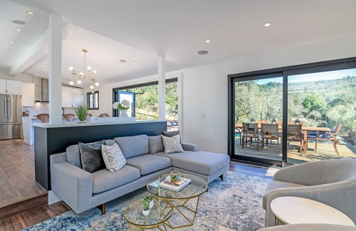 3 Bedrooms, 2 Baths, Sleeps 6. Perched on a hill overlooking a lovely meadow and hills to the east, guests arrive at this fully remodeled modern home, conveniently situated between Sonoma plaza and Glen Ellen. If you appreciate truly indoor/outdoor living with beautiful views, and being a short hop to all that Wine Country has to offer, you will love this house and grounds.