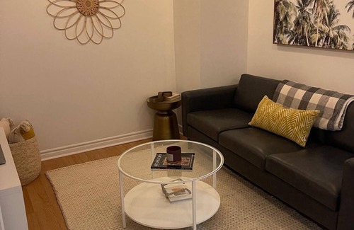 This curated designer suite is a serene stay just 30 minutes from the airport with easy access to public transportation, parks & walking trails. Hot tub, outdoor patio set, large soaker tub and co-working space all added for your convenience and comfort.
