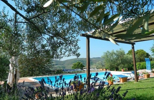 The swimming pool is 7 meters (23 feet) large by 14 meters (46 feet) long, from 90 centimeters (2.9 feet) to 1.4 meters (4.6 feet) deep. The area is equipped with tables, chairs, sun umbrellas, sun loungers and an external shower, and it is partly shaded by awnings. From the swimming pool you will enjoy a lovely view of the greenery and of Monte Santa Maria Tiberina. You will share the pool with guests staying at 7 other apartments. The swimming pool is open from mid-May until the end of September.