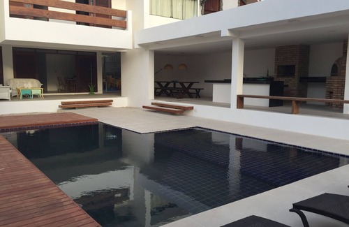 Large fully furnished house, 40 meters from the sea, with 6 bedrooms, 3 suites (all with air), 7 bathrooms, garage (5 cars), pool with deck, gourmet space (barbecue, wood-fired pizza oven and cooktop), Kitchen (freezer, fridge, 5-burner stove, sandwich maker, blender, ice cream, cabinets with kitchenware). In the best stretch of the sea. Maximum allowed 14 people.
