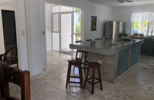 This property is a three story detached house ( with big garden ) with an open plan and an American style kitchen. The kitchen includes granite countertops and glass cabinets and is fully equipped. It also includes a new stainless steel refrigerator , another small fridge and a granite topped island with a gas stainless steel cooktop. The house includes a spacious living and dining area.. The property has three bedrooms; one downstairs and two en suites on the second floor. The upstairs suites enjoy a full terrace and ocean view. One of the en suites has been remodel in 2022 ( new concrete roof ) has a king sized bed, and the second master suite also enjoys a king sized bed. The third bedroom on the ground floor has one queen sized bed and one full size bed. All bedrooms have A/C units. All bathrooms are spacious and have been recently remodeled with marble /tile vanities and marble sinks. The large backyard consists of a huge terrace facing the ocean, leading to the 11 meter long laguna pool. The back yard has sand so children can play in the sand or enjoy the pool while parents can watch them from the covered terrace while sipping their favorite drinks. The front yard has a large private circular driveway. The house has a WIFI which is great for streaming movies, shows , news, sports events on all guest's devices. If you own Netflix you can watch it in Mexico. The house has no TV monitor. Downstairs is Telmex infinitum and upstairs and Netgear router (user name UPSTAIRS ) . Passwords will be provided..Outdoors : there is a charcoal grill. Washer is in the laundry room located at the left corner of the terrace facing ocean.The property is extremely spacious and private and is perfect for families both big and small. The property manager is available 24/7.