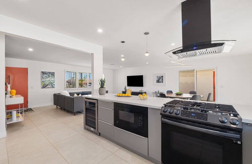 Welcome to Casa del Sol, an exquisite midcentury modern retreat that effortlessly blends classic design with tropical charm. This stunning property features a unique Polynesian-inspired roofline and includes a newly constructed 1-bedroom, 1-bathroom casita—all set against the picturesque backdrop of the San Jacinto Mountains. Perfectly suited for larger groups, this home accommodates up to 8 guests and is ideally located within walking distance of Ruth Hardy Park and the vibrant downtown area, making it a prime choice for your next getaway.