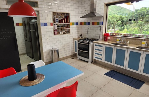 Casa Feliz at Itaipava, Petrópolis, is perfect for large families looking for the best of the mountains with great comfort. Very equipped, the house has 7 bedrooms, 5 of which are suites, all with air conditioning. We accommodate up to 18 people with all comfort. For leisure, a huge swimming pool, two gourmet areas (one for summer and one for winter), TV room, whirlpool and more. Located in a gated community in a prime location, with easy access via BR040 highway. Includes daily maid service.
