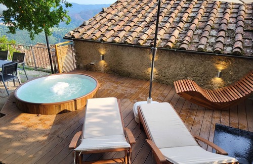Set in grounds of approximately 1000qm, Casa Melograno is surrounded by nature with woodland on the upper levels. A patio with a pavilon for alfresco dining, offers breath taking views of the surrounding hills and valleys down to the Mediterranean sea and even the island of Elba 120km away. A secluded sun-deck has a "sunken" Spa-pool (for up to 7) and a solar shower. At an altitude of 500m and only 12km from the sea, Gombitelli benefits from a refreshingly cooler climate than that of the low laying planes of Pisa, Lucca and Viareggio.