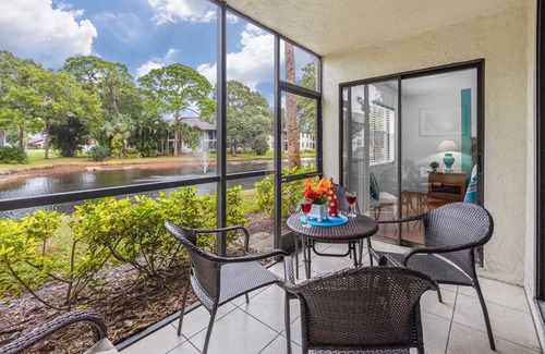 Enjoy a morning cup of coffee or an evening glass of wine in the lanai while soaking up the beautiful scenery right at your door step. If you would like to hear the sound of the water fountain and enjoy the fresh air, no problem, relax in a fully screened lanai and enjoy the soothing sounds of the water as it cascades from the fountain.With 1250 sq. feet of luxury, there is ample room to comfortably host up to 5 people (additional nightly fee for 5th person). The impressive large master bedroom and on-suite includes its own oversized walk-in shower, walk- in close. A large dresser and two night tables provide plenty of space for all your storage needs.