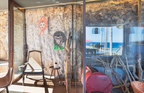 Villa Casa Pablo is a most charming and original holiday home. The living room is pleasantly furnished with brown sofas and armchairs with bright orange hints brought by the pretty round table surrounded by four velvet armchairs. All is fine and comfy, in front of the stunning ocean view, and the incredible natural stone wall at the back. The well-equipped kitchen is located in the same open space and has a large central island that can accommodate six people for delicious breakfast or dinner inside. This very comfortable living room, with gray and brown tones contrasting with the magnificent view over the bay, can be either open onto the terrace or closed and air-conditioned as you wish.