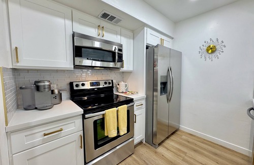 The fully stocked kitchen has everything you need for at-home dining, including stainless steel appliances, cookware, and plenty of counter space.