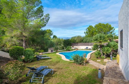 Located in the beautiful and secluded area of Betlem, Villa "Romani" exudes the distinctive charm of Ibiza's architectural style. Shielded from the wind by the eastern coastal mountains, this retreat offers a panoramic view extending from the nearby seaside to the foothills of the Bay of Alcúdia. Meandering quarry stone paths encircle the property, leading to a shallow pool and manicured lawn. A covered outdoor dining area with a barbecue beckons for leisurely al fresco meals, seamlessly transitioning to a terrace adorned with flower beds, granting access to the expansive 450 m² living space spanning two levels.