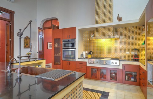 The first room you enter is a bar, decorated with a towering art display with a "loteria" game theme and complete with multiple wine refrigerators, a beer tap and ice maker. The bar is made out of hammered copper imported from Michoacan. The art in the bar is entirely sourced from Mexico. Next to the bar is an entertainment room with theater-style seating and a variety of art works from some favorite movies and television shows and a 75" flat screen tv. The kitchen is a fully equipped chef's kitchen with a 6 burner stove and all the equipment you could desire to make gourmet meals. The dining room table is a massive live-edge table, which is 1 meter x 3 meters large and seats 10 or more very comfortably. The two bedrooms on the first floor of the restored house featured "hanging" king-sized beds -- a combination of the hammock and a mattress bed that sway softly as you sleep (they feel like a cruise ship or a baby's cradle, but have the comfort of a mattress).