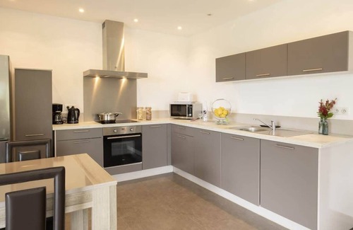 Fully equipped kitchen: induction hobs, microwave, oven, dishwasher, filter coffee machine.