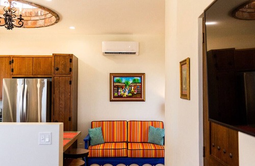 The “Cortez” is situated beach-side, right on the sand and in front of all the action with unforgettable views of the water and Ceralvo island. Enter the gated/paved courtyard which has outdoor “Monterey” style furnishing, catch up on some reading underneath a shady Palo-de-Arco covered area that includes a bbq and foot bath/rinse area or ponder what your next adventure will be. The “Cortez” comes with a super comfy king size bed. It has a full size chef’s kitchen including peninsula seating area for dine-in nights. The private bathroom is roomy and pleasing boasting a unique round turret shower.