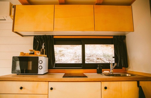 A cozy 222-square-foot tiny home with easy access to water, a fully equipped kitchen, and excellent bathroom facilities. These amenities include an eco-friendly cassette toilet, hand basin, and shower (gas heated for hot showers).