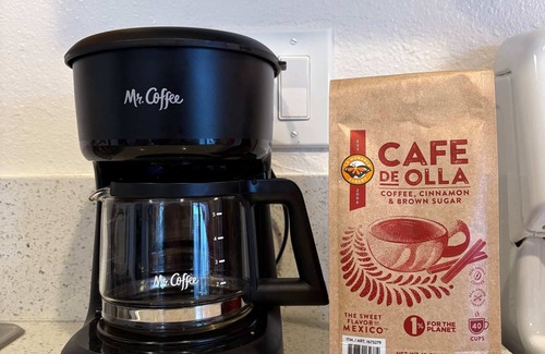 -Coffee maker with coffee, filters, creamer, and cane sugar