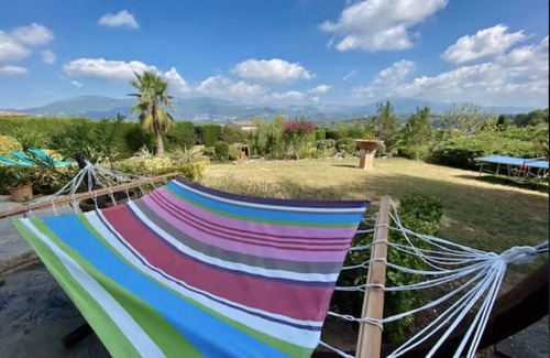 This air-conditioned holiday home at the French Riviera has a huge private garden planted with trees and a large secure private swimming pool (11x5m) surrounded by terraces and a playground. One of the terraces opens onto a large summer kitchen with plancha and barbecue.