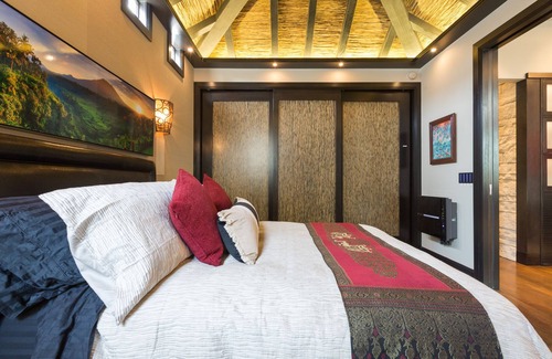 Offering 11-foot high ceilings and an air purification system, this home includes home automation light switches with integrated mood lighting, Sonos music, integrated speakers, and remote-controlled operable skylights. This 1-bedroom 1-bath house offers a formal dining room and a modern chef’s kitchen. It has a tropical-themed master suite with an up-lit thatched ceiling, a multi-head glass-enclosed rain shower, heated bathroom tiles and toilet seat. If needed, a very comfortable queen-size air mattress with a memory foam topper is set up in the study area to accommodate up to 4 guests.