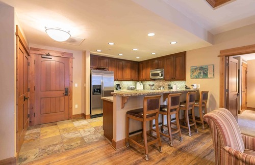 This slopeside residence features exceptional sleeping capacity (sleeps 9) as the master bedroom offers a twin-over-double bunk bed and an additional king bed, a kitchen with granite countertops and gas range, a master bathroom with dual sinks, shower and soaker tub, a gas fireplace and washer/dryer.