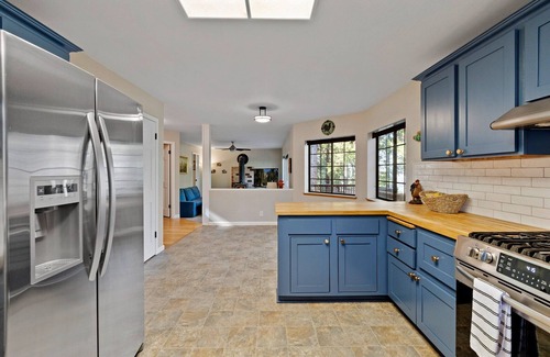The formal living room boasts premium Ashley couches, a cozy fireplace, and bay windows with stunning views of cedar and pine trees. Perfect for snowy days or cozy summer evenings with friends and family. Our family room is your chill-out zone, featuring a large sectional couch, a 65” smart TV, and a wood stove.