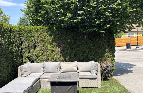 2 bdrm home. Primary furnished with king size bed and second bedroom furnished with trundle bed (1 double + 1 queen). Bright space that can sleep 6 people. Comfortable outdoor sectional with fire table for those cozy nights. Nespresso coffee to fuel your days!