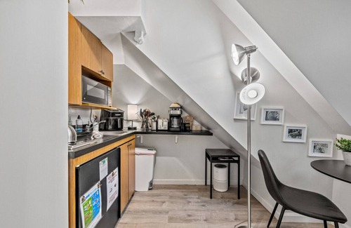 Immerse yourself in the privacy of your own exclusive retreat, complete with a fully furnished bathroom, ample closet space, and a well-equipped kitchen. This exceptional gem nestled in the heart of Manhattan ensures a delightful stay. The studio features a comfortable double bed, a fully stocked bathroom with all the necessary amenities, and a convenient kitchen. Additionally, a table and chair set are provided, serving as a versatile space for dining or as a dedicated work area. We have also created a cozy corner seating arrangement where you can indulge in reading or enjoy the flat-screen TV that comes pre-loaded with popular streaming services like Netflix and HBO. To accommodate your personal belongings, a spacious full-size closet is at your disposal throughout your stay. The bathroom boasts a well-stocked selection of essential toiletries and fresh towels, ensuring your comfort and convenience.