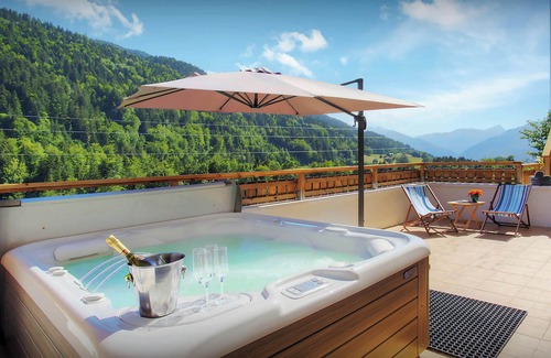 Sporty guests will appreciate the direct access to the ski storage from the parking, meaning wet sports kit can be offloaded downstairs as soon as they arrive back home. Outside, the panoramic views from the jacuzzi, on the south-facing terrace to the front of the chalet are peaceful and calm.