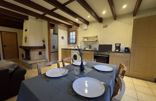 Layout: Living room(TV, dining table, fireplace, seating area), open kitchen(hob(induction), electric kettle, toaster, coffee machine, dishwasher, fridge-freezer, dishes and cutlery), bedroom(single bed, single bed), bedroom(double bed), bathroom(shower, hairdryer), Internet access, Garden Furniture , heating, terrace, garden, parking, swimming pool(shared with other guests)