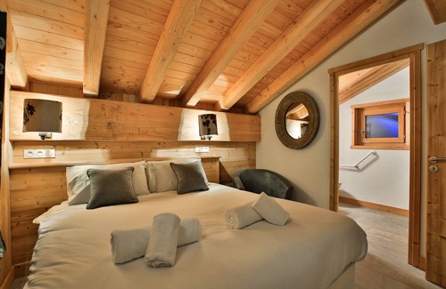 This fancy ski-in chalet apartment split on two floors offers traditional alpine comforts combined with contemporary facilities and it has a great location in La Plagne.
