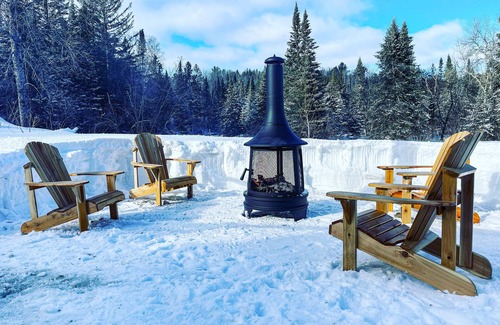Chalet l'Évasion offers 2 acres of land. Enjoy an outdoor fireplace overlooking the river. Next to the outdoor fireplace is the spa, accessible from the ground-floor bedrooms. Put on your robe and enjoy the spa and fireplace area.