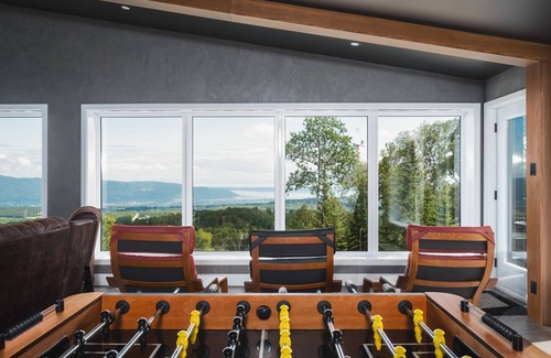 La Jolie Chouette built in summer 2023, this home is characterized, among other things, by its modernity and its three-story facade windows. At its heart of 4,500 square feet, it offers all the amenities you aspire to. Perfect for families, friends or groups, as it has the advantage of comfortably accommodating up to 16 people and offering memorable spaces for relaxation, sports, fun and gatherings (weddings, lake-parties). -the shoulder, annual holidays, birthdays). In winter, snowmobilers ❄️☃️can reach the trails directly from the house.