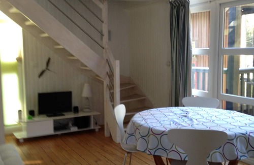 It can accommodate six people. With an area of 65 m² it consists, on the ground floor of a kitchenette, a living room, a bathroom, separate WC and a bedroom with a 140 bed. Upstairs are two bedrooms each equipped with two 90 cm beds.