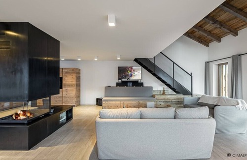Semi-detached village house on 4 levels. Entrance on one level. Ground floor: garage (1 parking spaces) + 1 outdoor parking space, laundry room. 1st floor: 3 bedrooms (2 twin beds 80x200 cm / 2 twin beds 80x200 cm / 2 twin beds 80x200 cm) with private shower rooms (shower and WC), 1 bedroom (2 twin beds 80x200 cm) with private bathroom (bathtub and WC) and balcony-terrace. 2nd floor: living room-kitchen, fireplace, balcony-terrace, 2 balconies. 3rd floor: 1 bedroom (2 twin beds 80x200 cm) with bathroom (shower and bath), separate WC. All inclusive (sheets, towels, end of stay cleaning). Old country barn renovated with great taste enjoying a privileged location in the heart of the village. Elegant and refined atmosphere with contemporary accents. Very high comfort. The large living room structured around the warmth of the central fireplace will undoubtedly witness unforgettable moments, whether you are there to hike, ski, rest or just get together.
