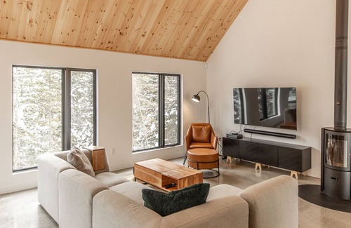 The particularity of this chalet is that the floors are reversed. That is to say, the bedrooms are ground floor and the main living area is located on the 2nd floor directly at the treetops. There is a fully equipped kitchen with a walk-in pantry, a pantry and a large dining room. There is also a large living room with a Scandinavian-style wood stove, a reading corner, a 65'' television, a Sonos sound bar and a very fast Starlink (Space X) wifi system.
