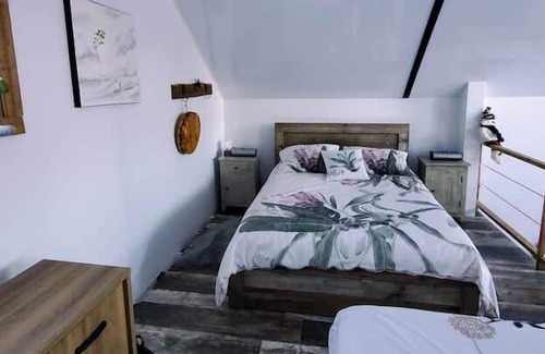 The chalet is arranged to accommodate up to 6 people: a mezzanine space with 2 Queen beds and 1 Queen sofa bed. Perfect for relaxing after a day of activities in a warm atmosphere. The living room space is equipped with a smart TV, an indoor wood fireplace, and a fully equipped kitchen.