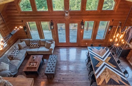 Enjoy a starry sky while singing around the fire pit or relaxing in the spa at our chalet, a spectacular full wood log house surrounded by nature. The unique First Nation themed decor, the architecture, the open concept design, the immense porch, the bedrooms’ en-suite balconies, the conveniences of a recently build structure as central AC and heating.Lots of activities await you.